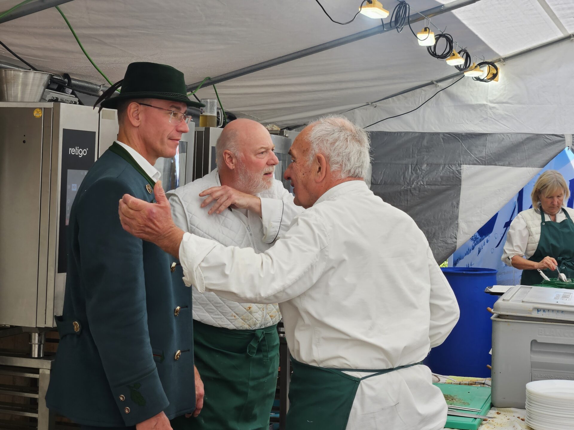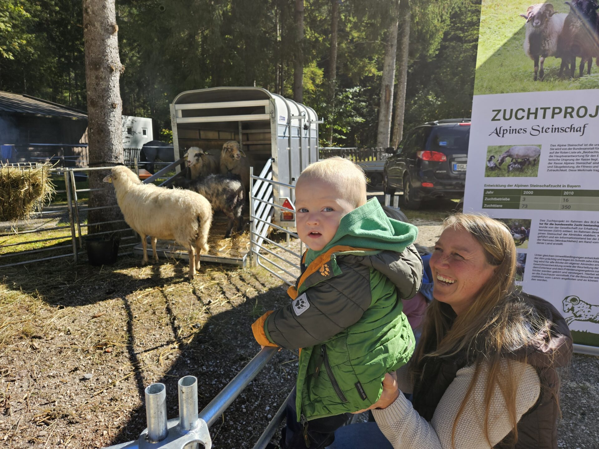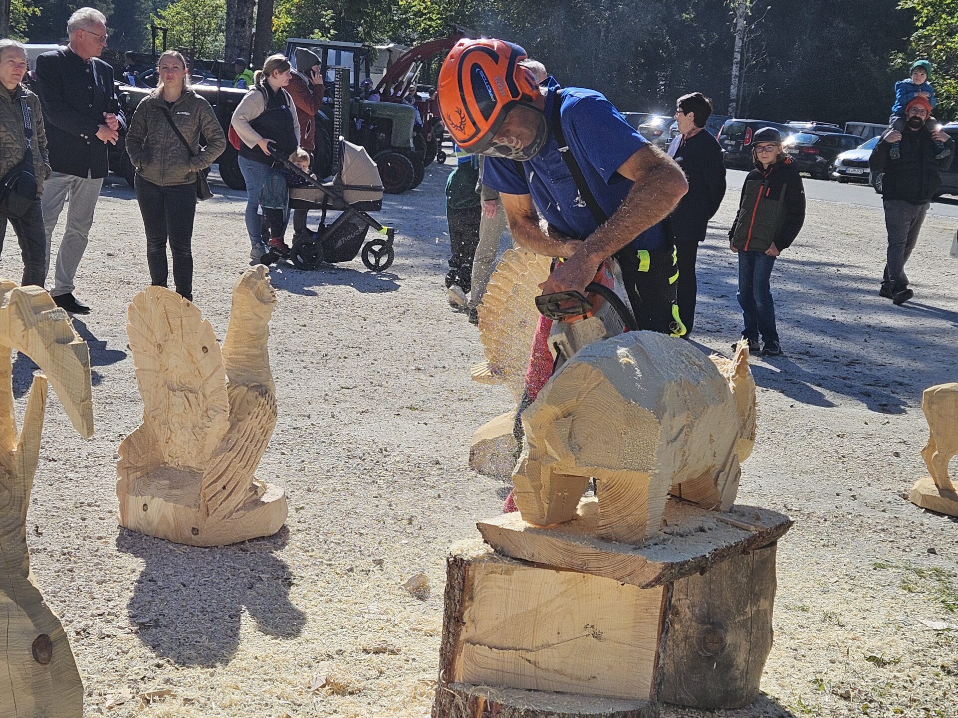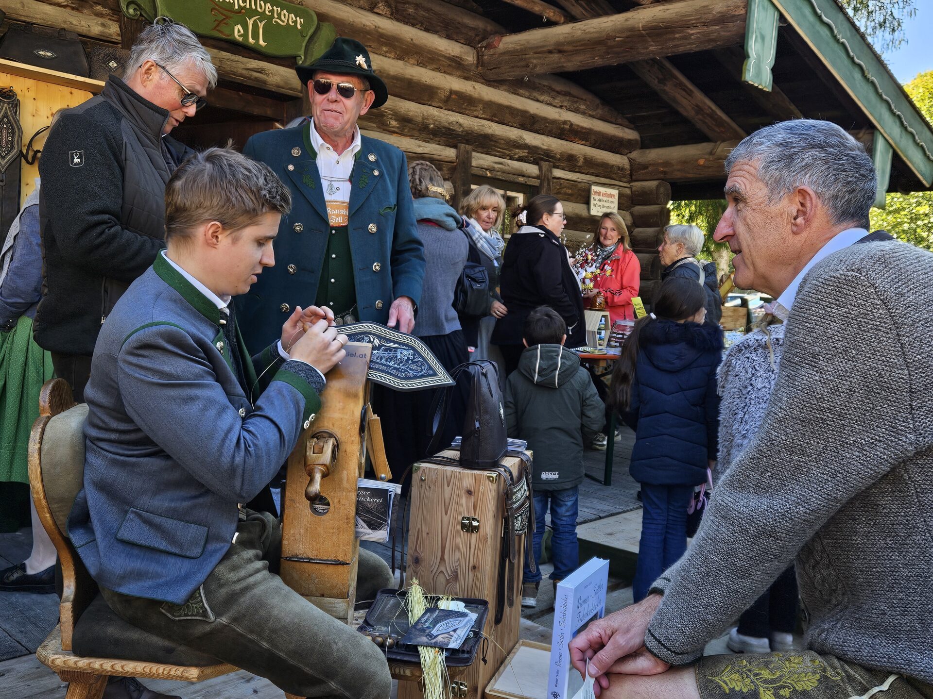 Großartige Stimmung herrschte beim „Herbstletzt“ in der Laubau, das der Trachtenverein D’Rauschberger-Zell am Tag der Deutschen Einheit veranstaltete. Vom riesigen Ansturm der Besucher, die sich trotz der anfänglich eisigen Temperaturen auf dem Gelände einfanden, waren selbst die Organisatoren angenehm überrascht. Denn frühmorgens mussten die Helfer zuerst noch die Sitzgelegenheiten von einer dicken Reifschicht befreien. Eingeläutet wurde das Herbstletzt mit einem Dank-Gottesdienst, den Teisendorfs Pfarrer Martin Klein zelebrierte, musikalisch umrahmt vom Alphornbläser-Quintett des Vereins. Das geistliche Vereinsmitglied hatte sich dazu – wie bei solchen Anlässen üblich – das historische Messgwand übergestreift. Gegen Mittag und den ganzen Nachmittag über zeigte sich dann die Herbstsonne von ihrer besten Seite, so dass die Gäste das vielfältige Angebot an bodenständigen Attraktionen und Darbietungen so richtig nach Herzenslust genießen konnten. Für Jung und Alt war jedenfalls eine Menge geboten. Die Vereinshütte thematisierte in einer Ausstellung historisches Gewand und Trachten, wie sie im Miesenbacher Tal einst getragen wurden, dazu passte der Stand des Federkielstickers, den man bei seiner handwerklich-künstlerischen Arbeit zuschauen konnte, im Freigelände tummelten sich zur Freude der Kinder verschiedene Schaf- und Ziegenrassen, und sogar ein Hufschmied zeigte anschaulich, worauf es bei der „Pediküre“ seines Süddeutschen Kaltbluts ankommt. In dieses Bild passten die Pferde-Gespann geführten Ausfahrten mit dem neuen Festwagen des Vereins, die altgedienten Veteranen-Traktoren und landwirtschaftliche Geräte sowie die kunstvollen Skulpturen, die der Motorsägen-Schnitzer entstehen ließ. Zwischendurch  konnte man sich über die Arbeit des Gartenbauvereins und der Imker informieren.  Neben Stelzengehn, Maßkrugschiam und der Hüpfburg erwies sich die eigens nach historischem Vorbild gebaute Holz-Kegelbahn als besondere Attraktion, so wie sie in früherer Zeit einfach zum Standard bayerischer Wirtshäuser gehörte. Bei so viel Betätigung kam natürlich die Geselligkeit nicht zu kurz, denn die Trachtenkapelle unter der Leitung von Stefan Huber spielte schneidig auf und die Kinder- und Jugendgruppe des Vereins zeigte mit den traditionellen Tänzen, dass die Nachwuchsarbeit beste Früchte trägt. Der Abteilung kommt der Erlös der Almbuschen-Versteigerung zugute. Bevor die Sonne ihren Dienst aufkündigte und es im beheizten Stadl weiterging, sorgte die „Diwan-Musi“ für den beschwingten Ausklang. Verwöhnt wurden die Besucher mit Schmankerln aus der Küche, mit Zwetschgenbavesen, Almnussen und selbstgebackenen Kuchen.  ls   Fotos Schick